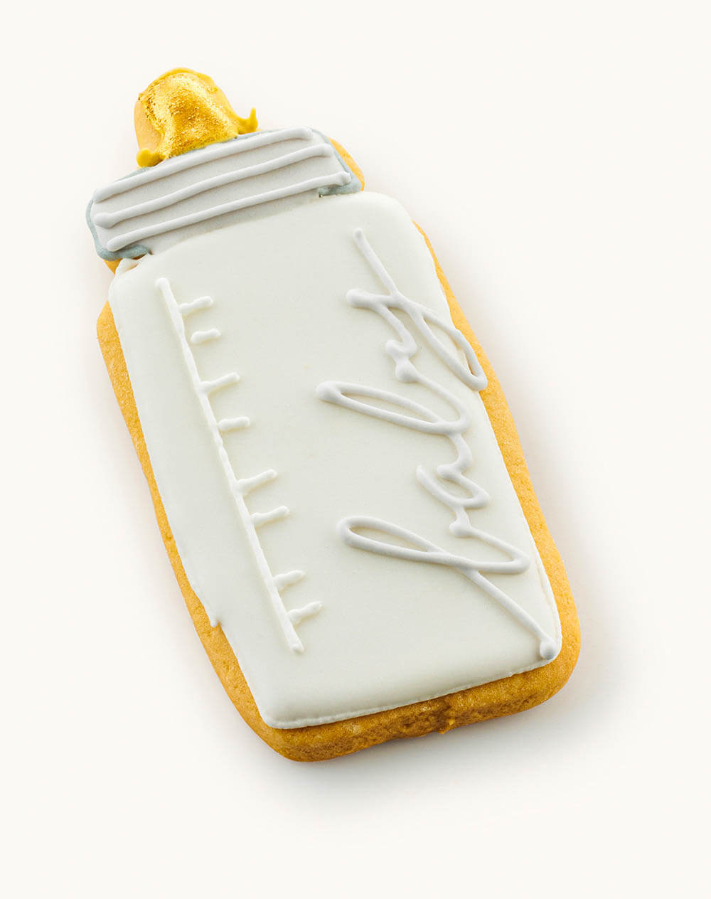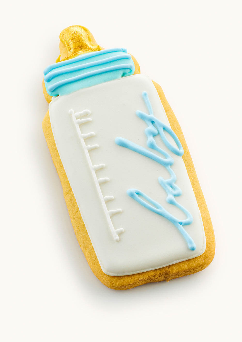 Increase the love and joy with miniature Baby Boy Bottle Shower Cookies. With ‘baby’ inscribed in delicate icing, these custom cookies are a winner at any baby celebration.