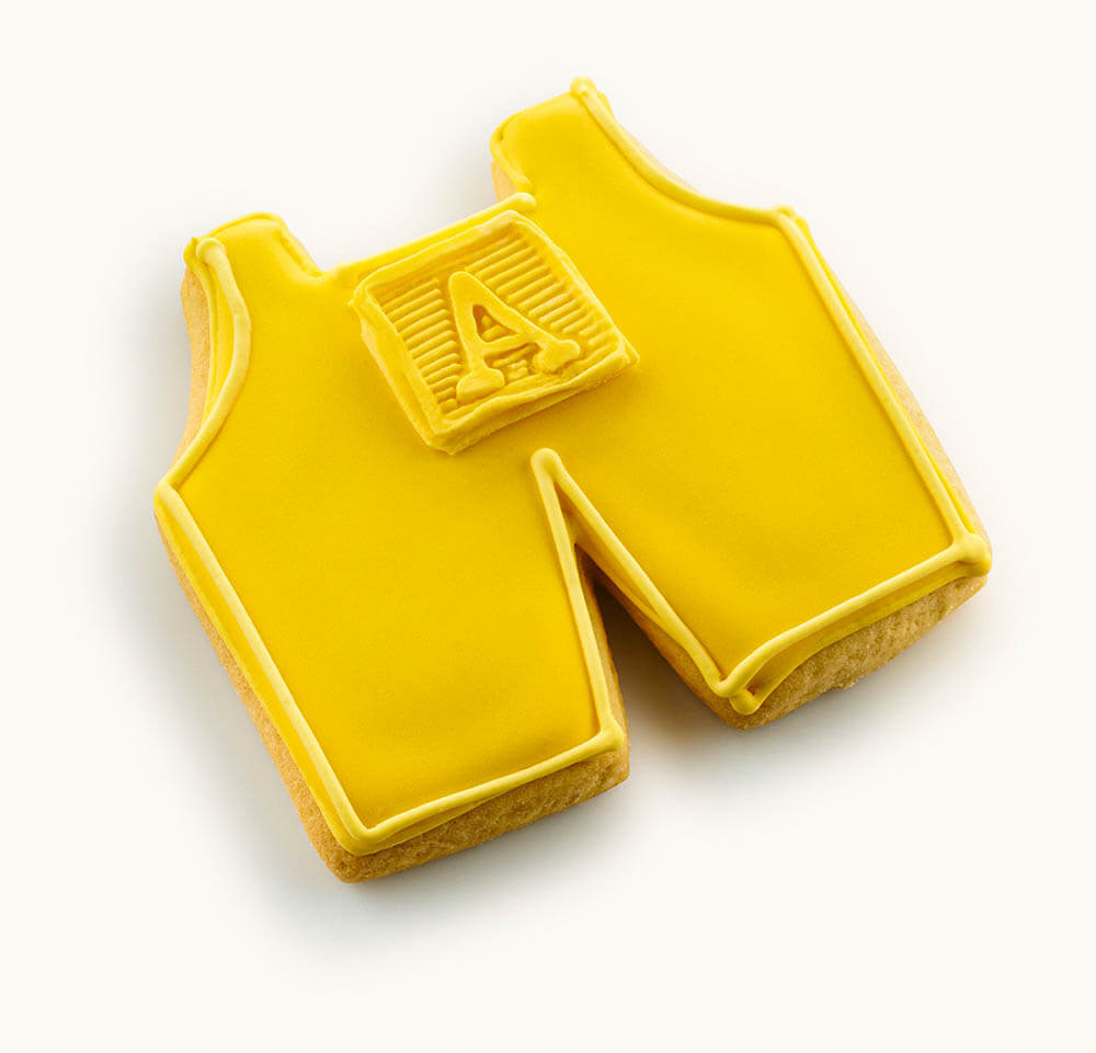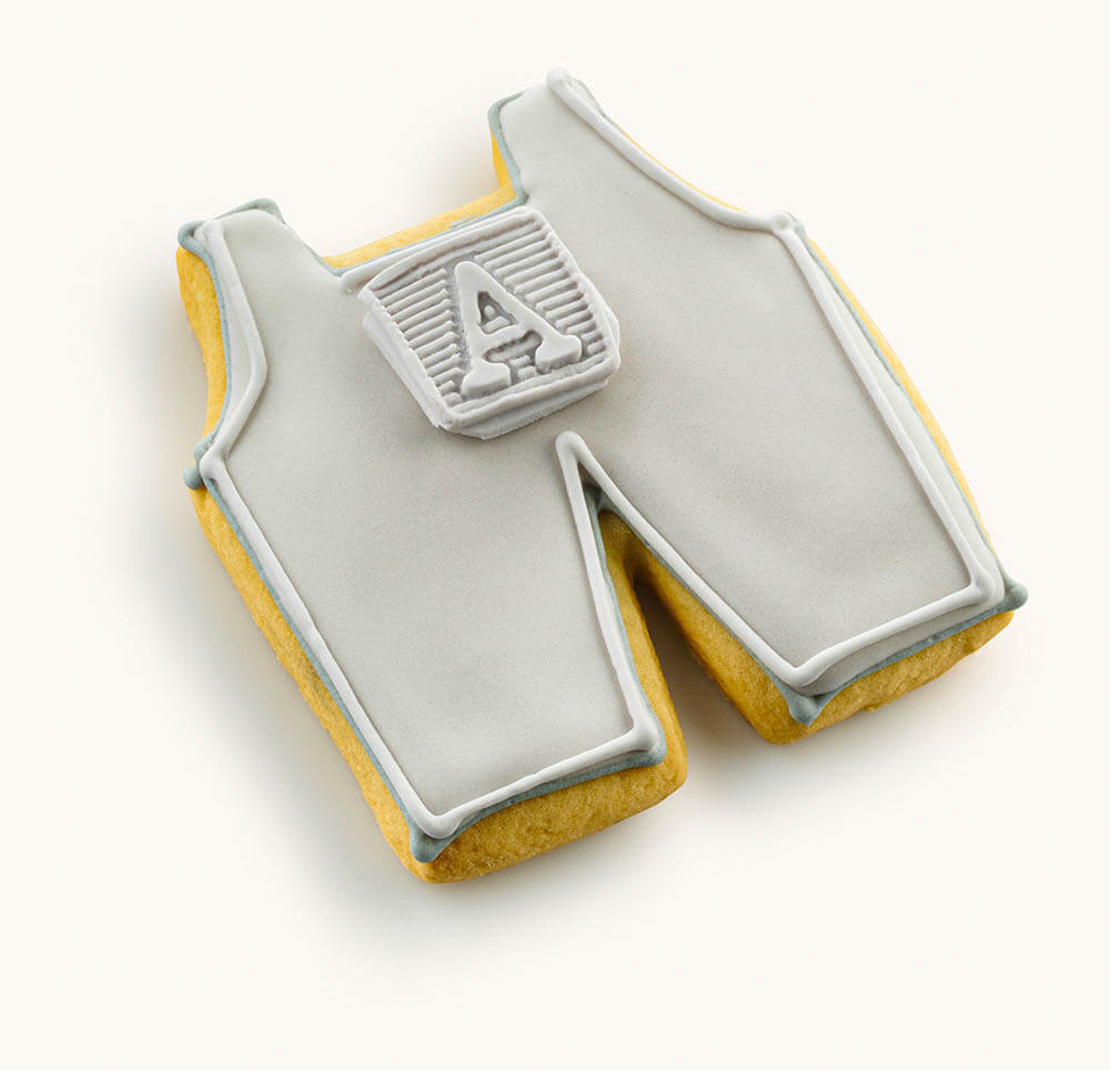 Custom decorated, these baby boy overalls cookies can feature a letter of your choice, the perfect treat to display at your bris, pidyon haben, baby shower, or birthday party.