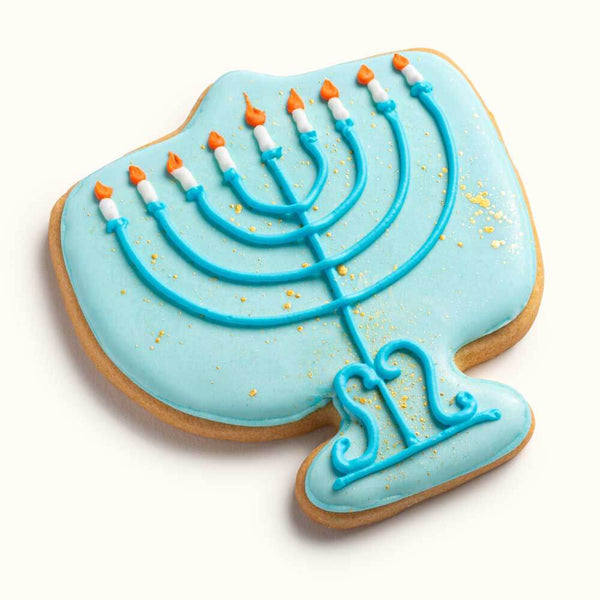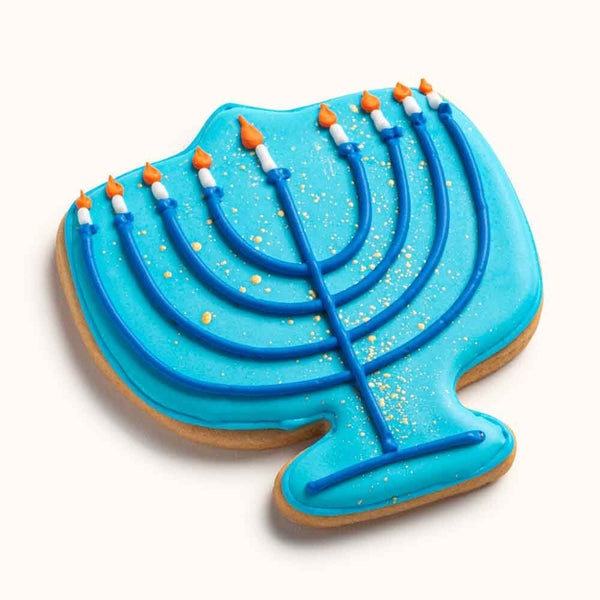 Traditional Menorah Cookie - beautifully hand decorated with vibrant blue coloring.