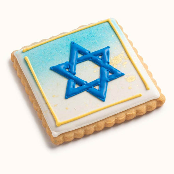 Star of David Square Cookie - edged in an elegant gold border over blue glittered background.