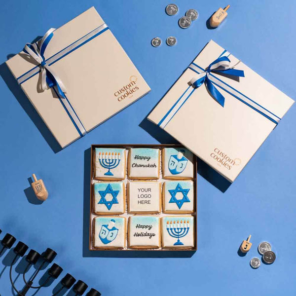 Set of 9 hand decorated Hanukkah themed cookies with Happy Hanukkah / Holiday greetings and your personal logo, packaged in our signature Custom Cookies gift box.