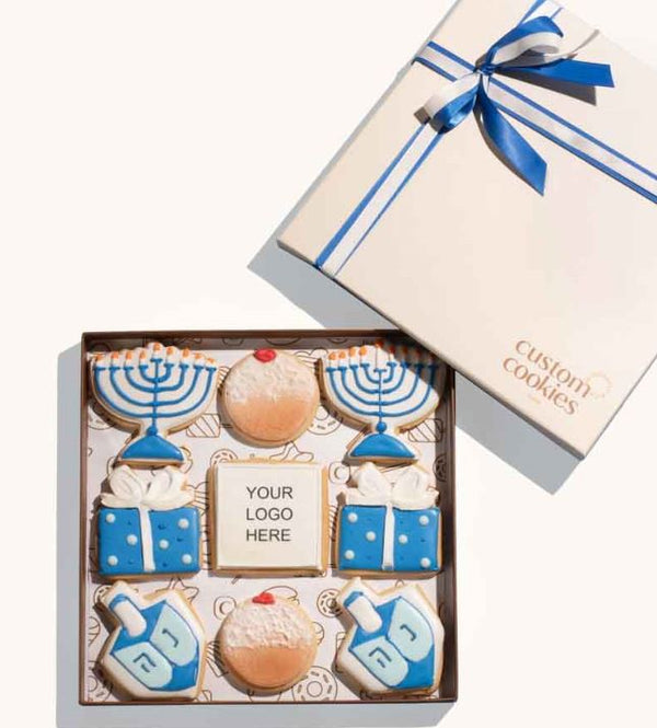 Set of 9 hand decorated Hanukkah themed cookies with your personal logo, packaged in a signature CustomCookies gift box.