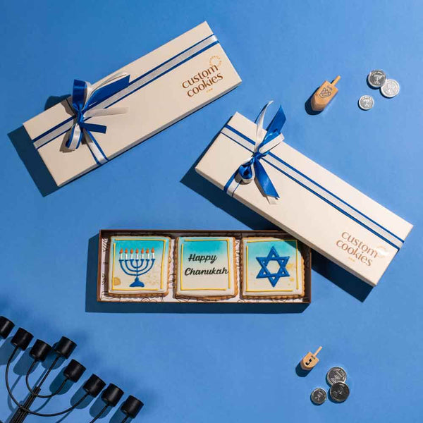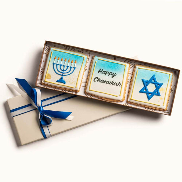 Set of 3 hand decorated Hanukkah themed cookies with packaged in a signature CustomCookies gift box.