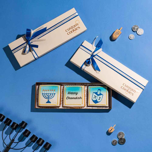 Set of 3 hand decorated Hanukkah Traditional themed cookies with packaged in a signature CustomCookies gift box.