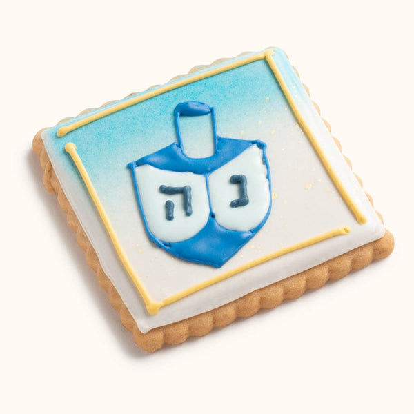 Traditional Dreidel Cookie - edged in an elegant gold border over blue glittered background.